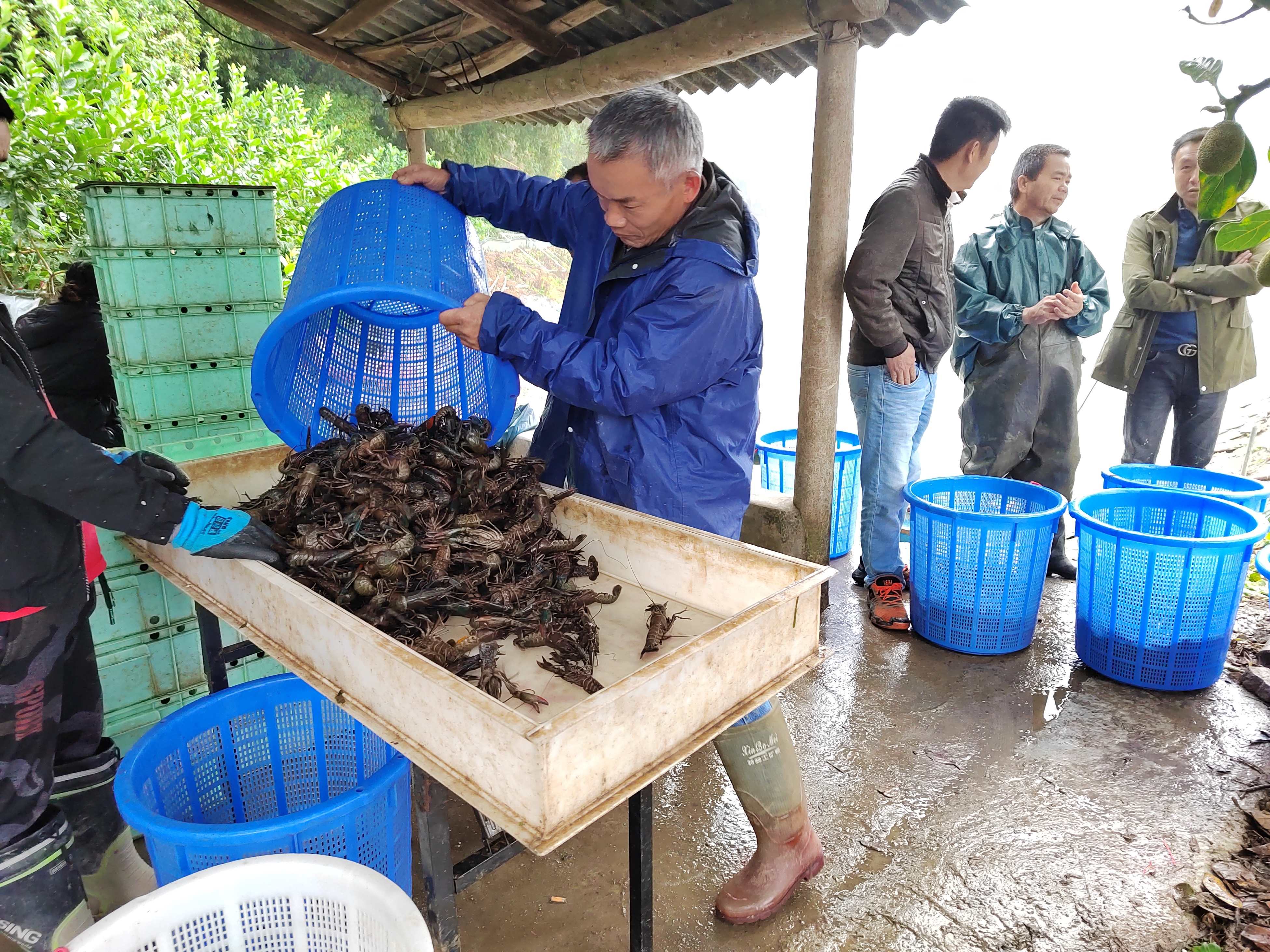 走进鹤山市蟠龙村,整齐的村道旁,一口口水塘上,养殖户们忙着收网、捕虾、上磅、装筐,一尾尾蓝龙露出“真容”。