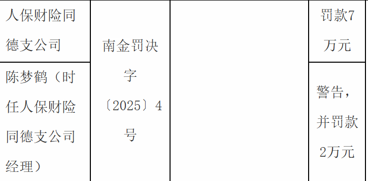 12月12日,国家金融监督管理总局海南监管分局行政处罚信息公开表显示,人保财险同德支公司因虚构中介业务套取费用被罚款7万元;陈某鹤被警告并罚款2万元。